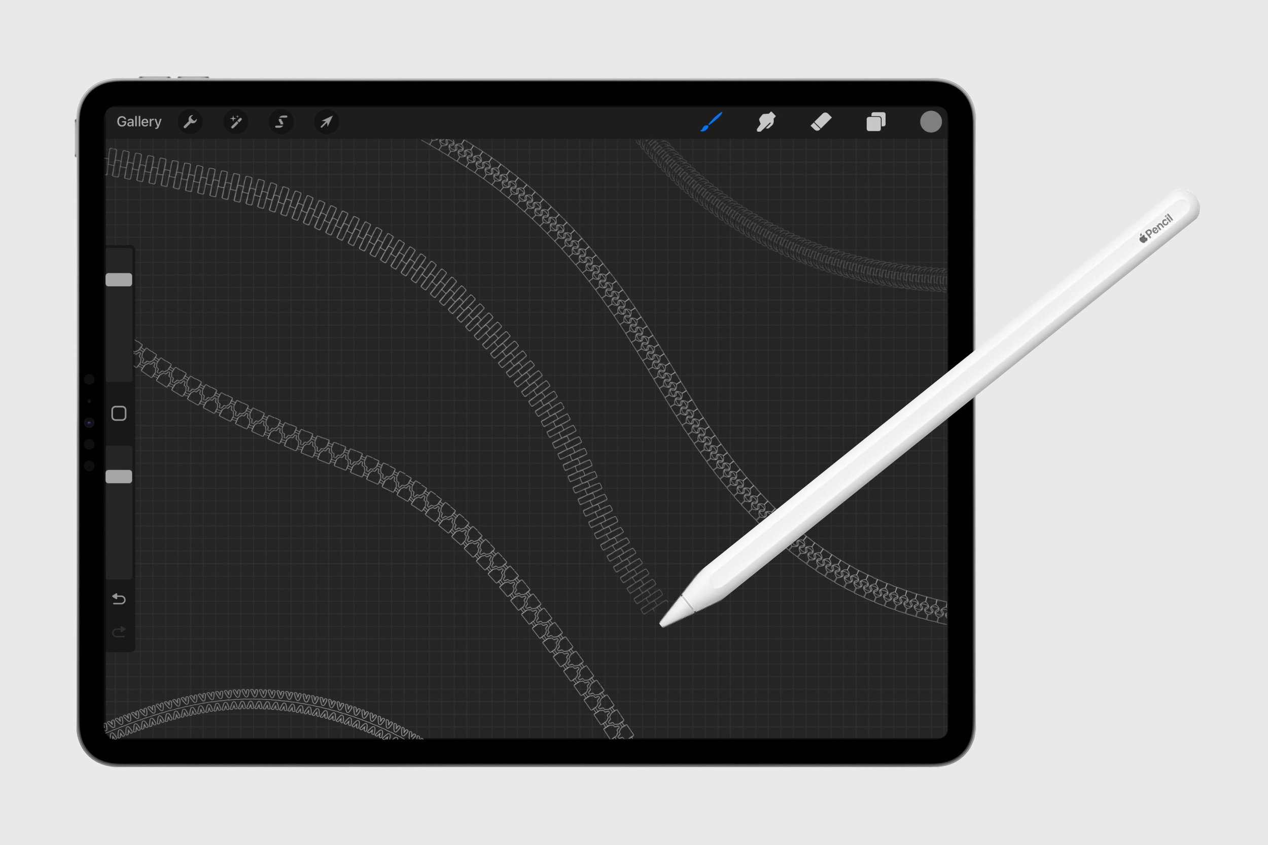 Draw YKK and Riri zips freehand using the Procreate calibrated brushes.