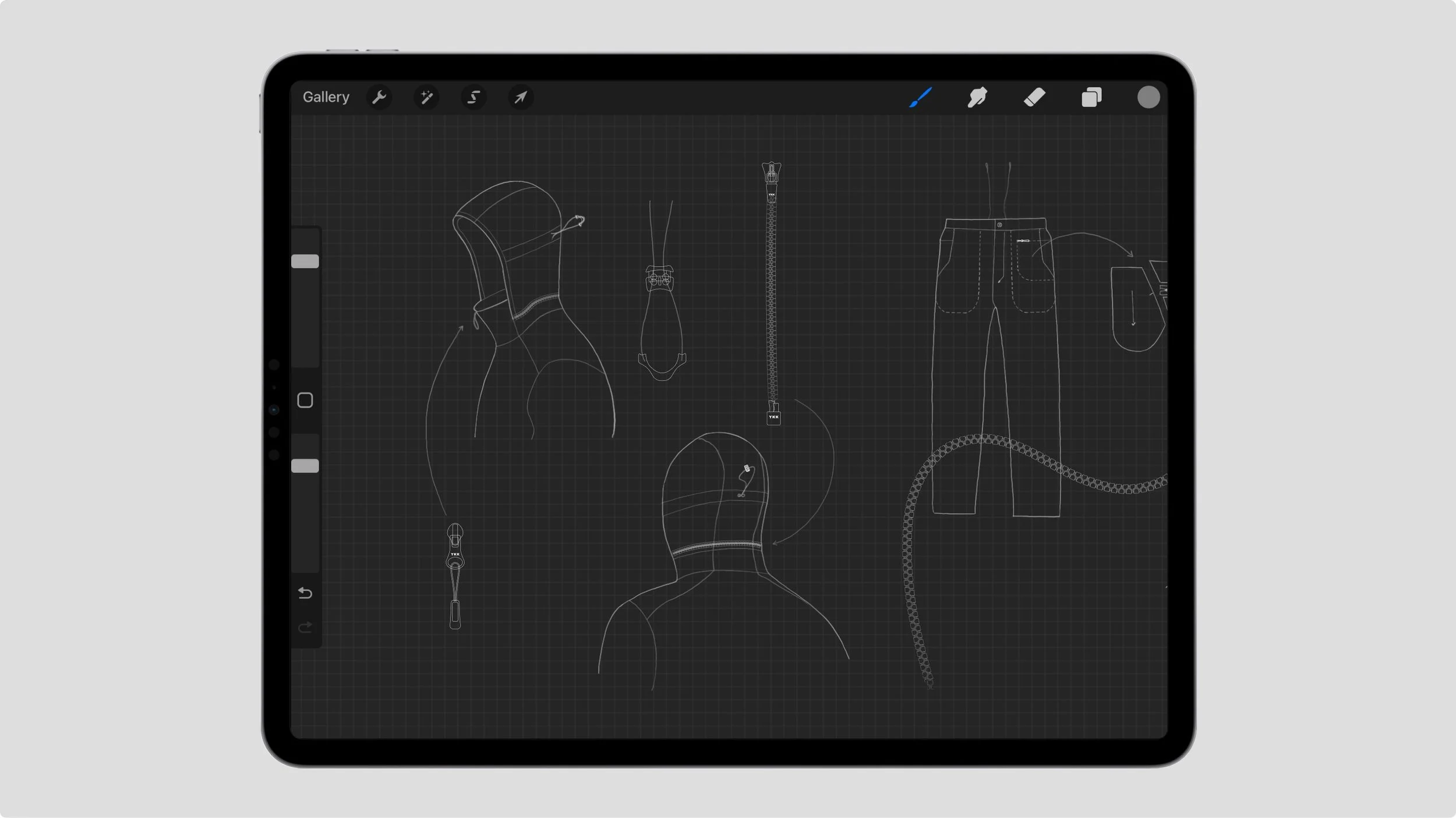 Add and arrange assets in your Procreate sketches until you’re happy with the result. Tag @techpackassets on Instagram to be featured.